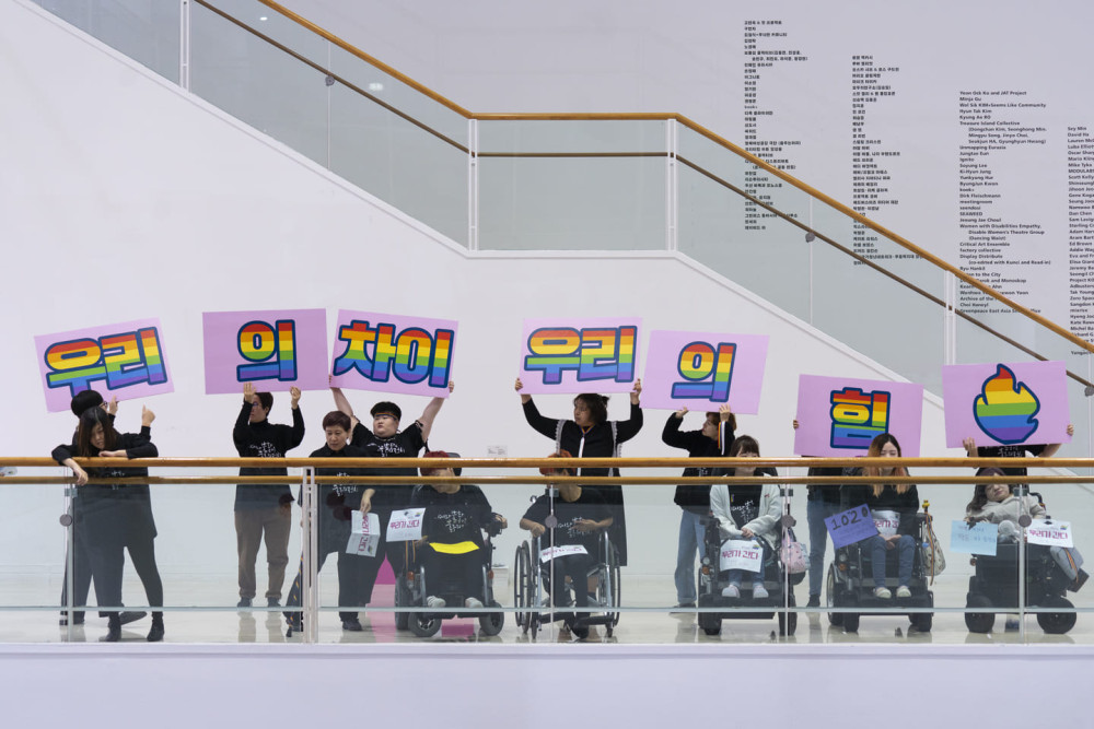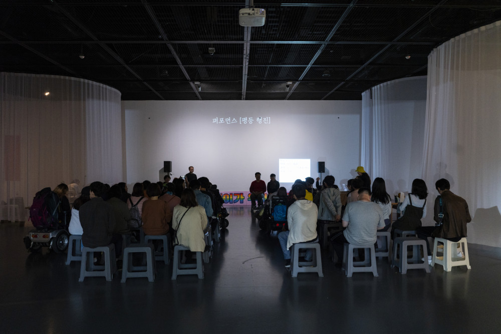 제10회 서울미디어시티비엔날레 《좋은 삶》 퍼포먼스 〈마침, 좋은 삶〉. 작가: 장애여성공감 극단 〈춤추는 허리〉. 서울시립미술관. 2018. 10. 03 - 10. 05. 사진: 스튜디오 수직수평(유용지+홍철기)